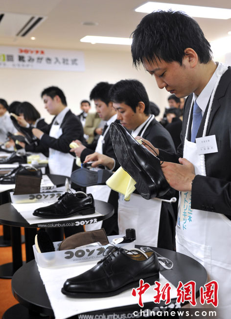 4月1日,日本一家鞋油廠新員工在入職儀式上為老員工擦鞋。圖片來源:中國(guó)新聞網(wǎng)