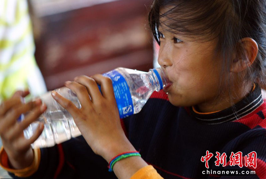 上課時(shí),孩子們喝在桌子上放著的礦泉水,現(xiàn)在他們每天發(fā)兩瓶水,很多孩子省下來一半帶回家給家人。沙浪 攝