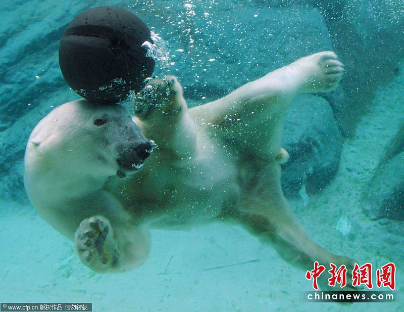美國Asheboro北卡羅來納動(dòng)物園一頭名叫威利的北極熊可是個(gè)“活寶”。任何一個(gè)可用的東西都能成為它在鏡頭前“耍寶”的玩具。圖片來源:CFP
