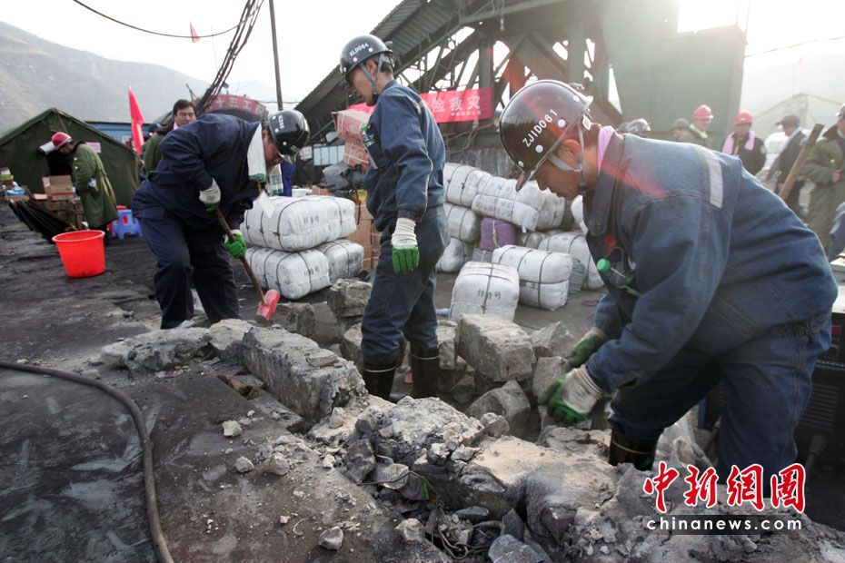 4月4日,華晉焦煤公司王家?guī)X礦透水事故第八天,為了保證急救的一切順利,搶險人員清理并搶修急救通道。中新社發(fā) 張云 攝