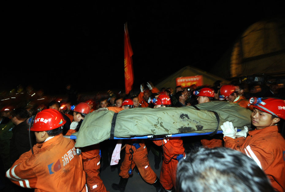 4月5日,首批獲救礦工被抬出井口。當(dāng)日,華晉焦煤王家?guī)X礦“3·28”透水事故首批獲救礦工升井,被急救車送往醫(yī)院救治。目前現(xiàn)場(chǎng)救援工作仍在進(jìn)行。圖片來源:新華網(wǎng) 燕雁 攝
