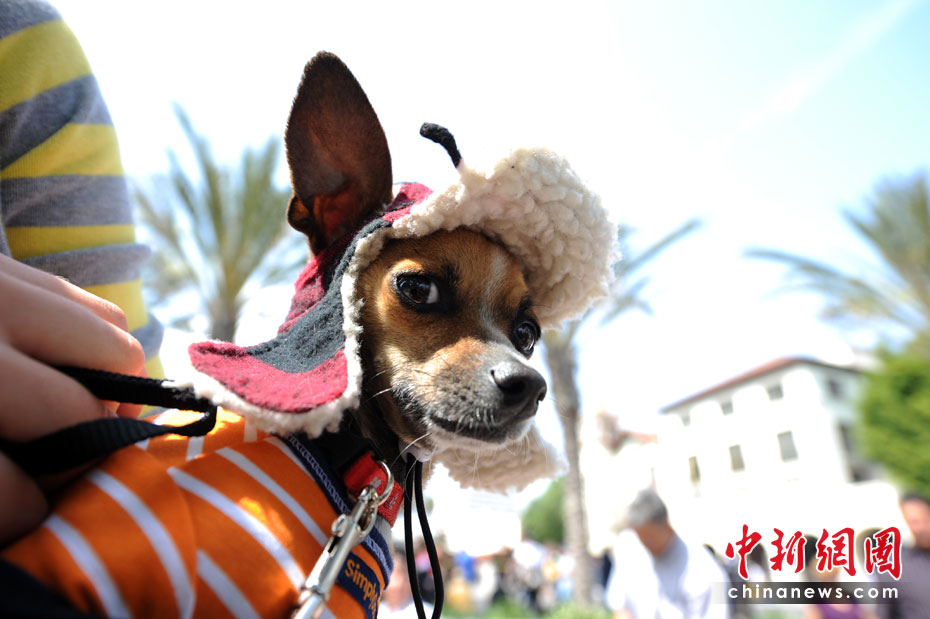 當(dāng)?shù)貢r(shí)間4月4日,美國(guó)洛杉磯人們?cè)跉g慶復(fù)活節(jié)的同時(shí),也為他們的寵物舉行了祝福儀式。這項(xiàng)祝福儀式每年舉行一次。圖片來(lái)源:中國(guó)新聞網(wǎng)