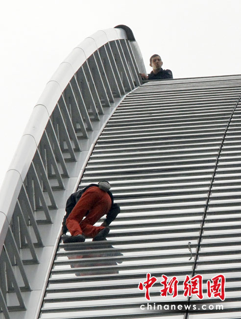 4月7日,巴黎,法國“蜘蛛人”羅伯特當(dāng)日用了大約50分鐘成功攀爬185米高的法國燃?xì)馓K伊士集團大樓。