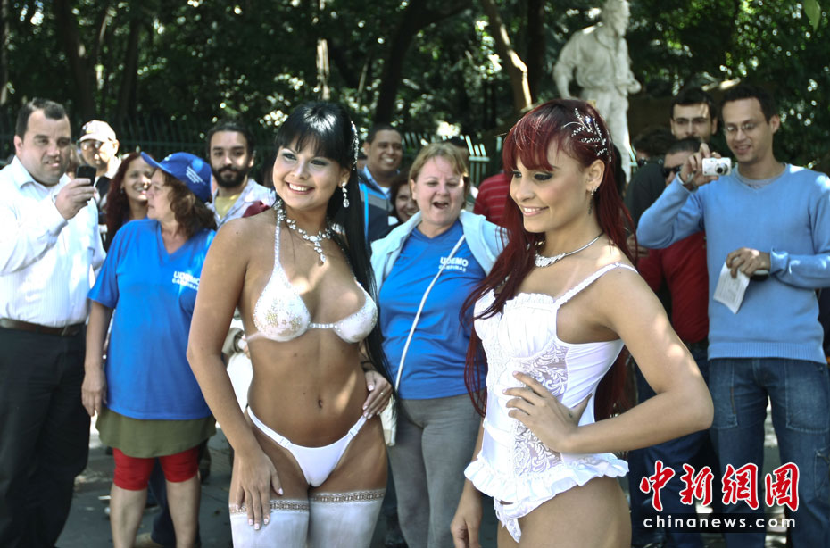 4月8日,巴西模特身著內(nèi)衣在圣保羅大街走秀,宣傳第16屆巴西情趣用品博覽會。圖片來源:中國新聞網(wǎng)