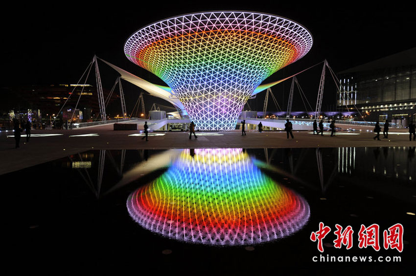 4月8日,上海世博會園區(qū)各大洲國家展館的建設和布展絕大多數(shù)已經(jīng)進入尾聲。圖為世博軸太陽谷在水中的夜景。梁臻 攝