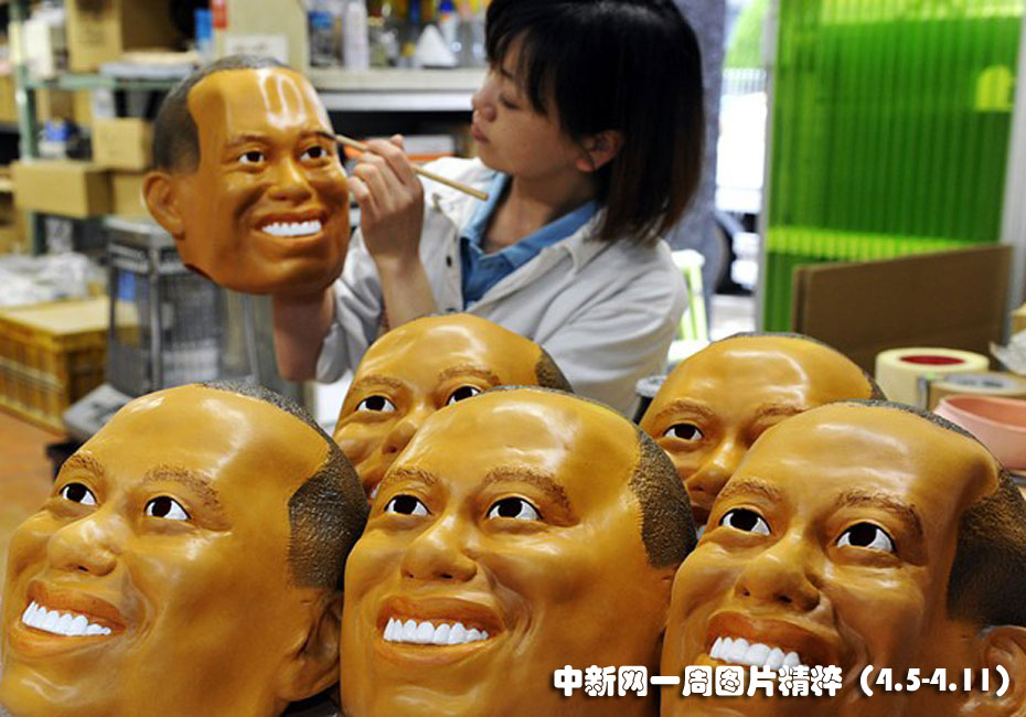 東京郊區(qū)的某個(gè)工廠正在生產(chǎn)美國(guó)頂級(jí)高爾夫選手老虎伍茲的橡膠面具。圖為一名員工在面具上勾畫眉眼。