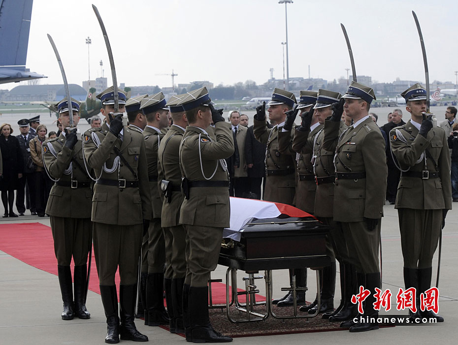 4月10日,卡欽斯基乘坐專機從華沙飛往俄羅斯斯摩棱斯克市,參加卡廷森林事件70周年紀念活動。途中飛機在斯摩棱斯克“北方”軍用機場附近降落時失事,共造成包括卡欽斯基夫婦及眾多政府高官在內的96人死亡。慘劇發(fā)生后,舉世震驚。圖為禮兵準備將卡欽斯基的遺體抬上靈車。