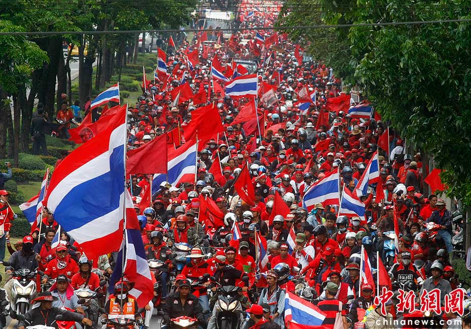 當(dāng)?shù)貢r(shí)間4月12日,泰國紅衫軍在曼谷市區(qū)抬著棺材舉行游行,借此向政府施壓促阿披實(shí)下臺。此前紅衫軍示威者與軍警發(fā)生沖突,造成21人死亡。圖片來源:中國新聞網(wǎng)