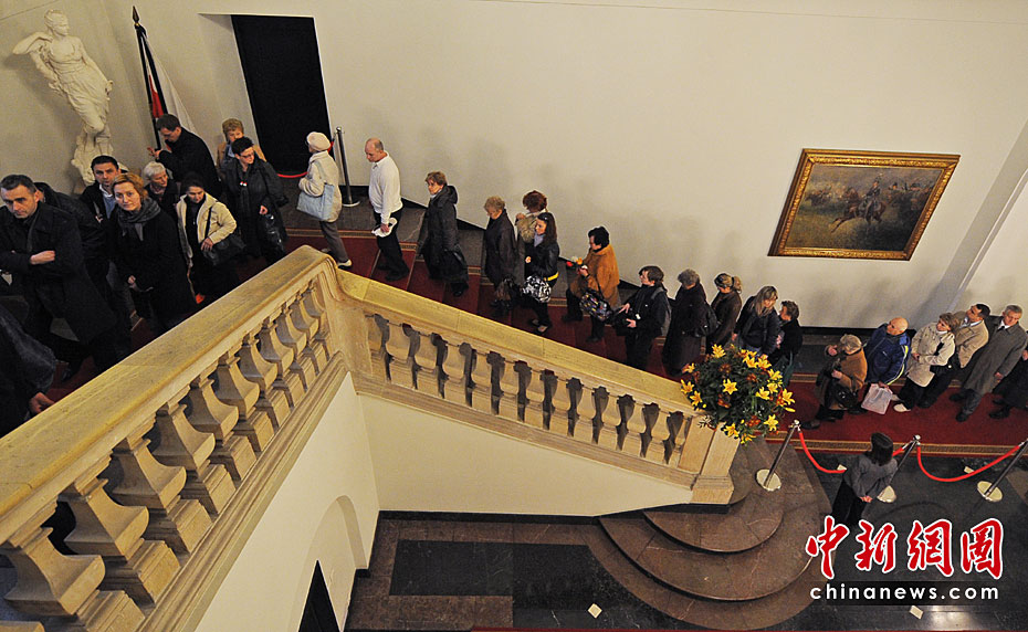 當(dāng)?shù)貢r間4月13日14時,波蘭總統(tǒng)夫婦的遺體被安放在總統(tǒng)府最大的圓柱廳供民眾瞻仰和悼念。總統(tǒng)卡欽斯基及其夫人的葬禮將于18日舉行。圖片來源:中國新聞網(wǎng)