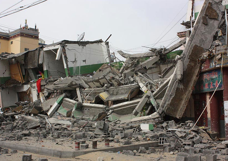 圖為4月14日拍攝的玉樹(shù)州結(jié)古鎮(zhèn)倒塌的房屋。圖片來(lái)源:新華網(wǎng) 吳宏 攝