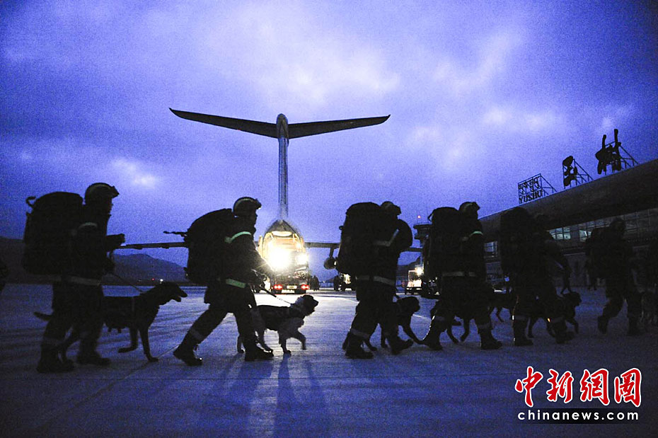 圖為4月14日20點20分,中國國際地震救援隊抵達(dá)玉樹機場。中新社發(fā) 廖攀 攝