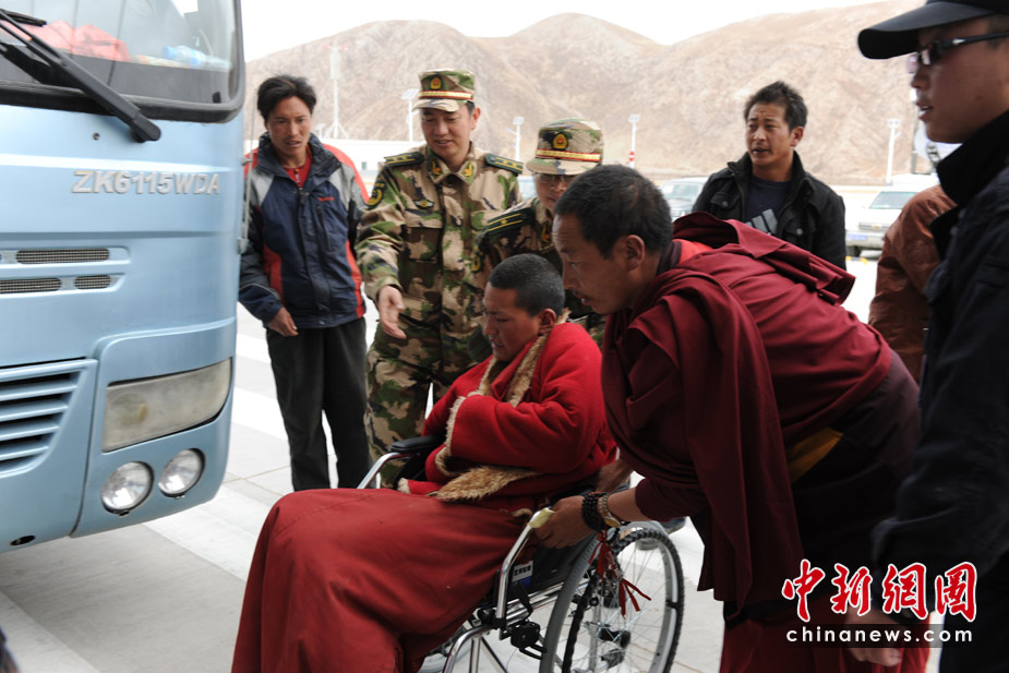 4月15日,玉樹地震傷員正源源不斷的從玉樹機場乘飛機,被運往成都等地救治。中新社/中新網(wǎng)記者 符永康 攝
