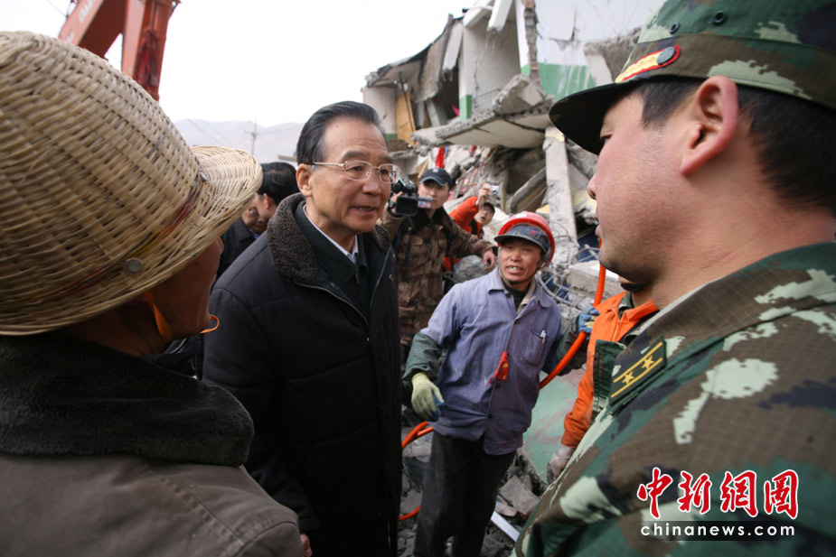 2010年4月16日10時許,中國國務院總理溫家寶來到青海省玉樹藏族自治州玉樹縣地震災區(qū)四川消防部隊玉樹教育局救援現(xiàn)場了解情況。4月14日07時49分許,青海省玉樹藏族自治州玉樹縣(北緯33.1,東經(jīng)96.7)發(fā)生7.1級地震。中新社發(fā) 劉忠俊 攝