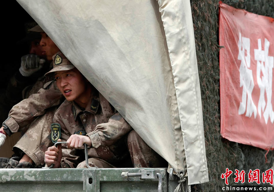 2010年4月16日,青海玉樹藏族自治州玉樹縣結(jié)古鎮(zhèn),剛剛抵達的三名解放軍準備投入現(xiàn)場救援。中新社發(fā) 盛佳鵬 攝