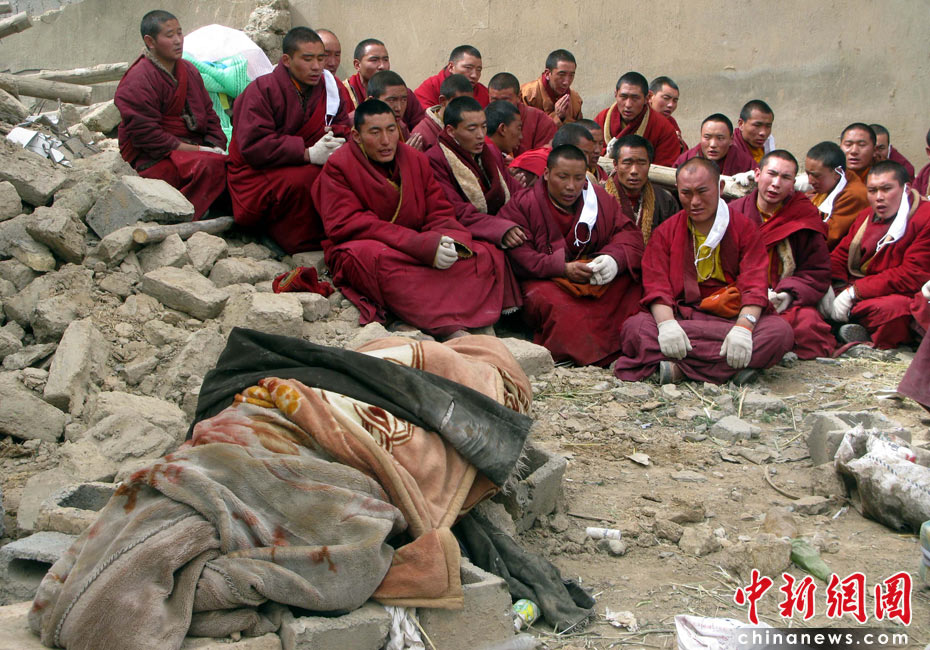 4月16日,青海玉樹震區(qū)僧侶們在廢墟邊為地震遇難者按藏族習(xí)俗進(jìn)行超度。中新社發(fā) 孫自法 攝