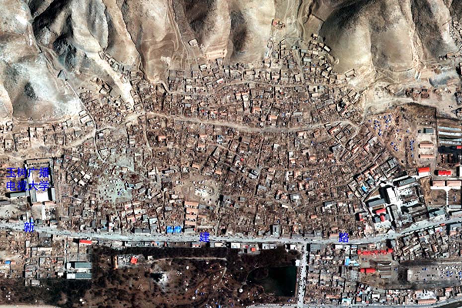 利用對(duì)地觀測中心2010年4月16日獲取的高分辨率航空遙感數(shù)據(jù),提取出玉樹州結(jié)古鎮(zhèn)城區(qū)范圍內(nèi)地震破壞最嚴(yán)重或典型地區(qū),使之與GoogleEarth中相應(yīng)位置的震前遙感衛(wèi)星數(shù)據(jù)進(jìn)行對(duì)比,直觀展現(xiàn)結(jié)古鎮(zhèn)在此次地震中的受影響程度。圖片來源:中國科學(xué)院