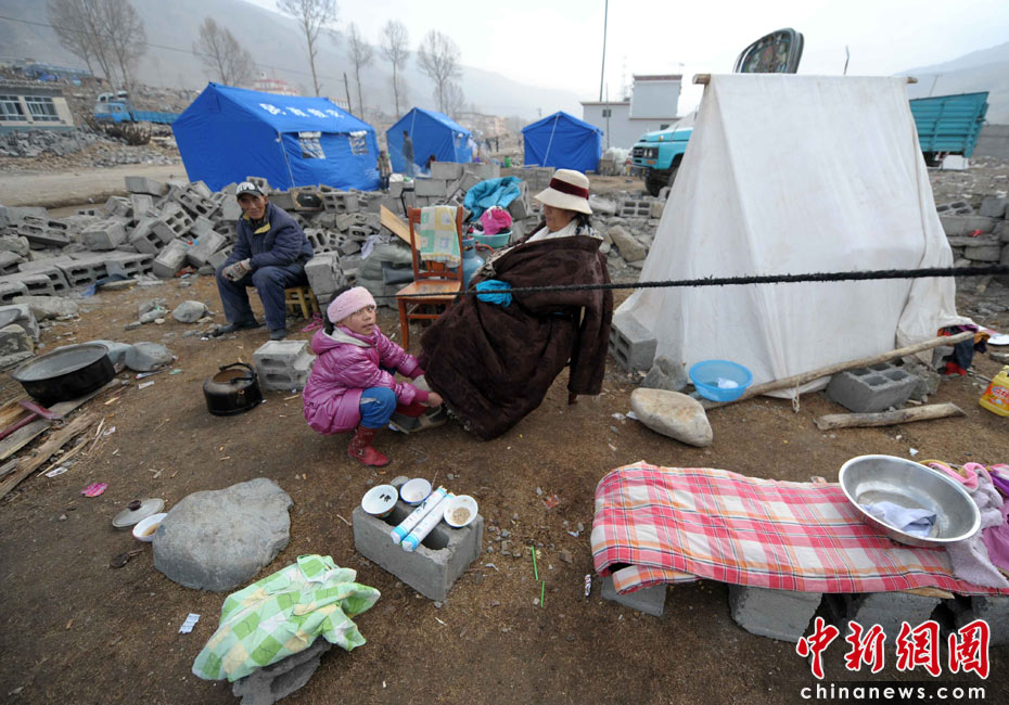 4月17日上午,青海省民政廳廳長(zhǎng)更陽(yáng)向媒體發(fā)布了一系列安撫救濟(jì)措施,災(zāi)民生活補(bǔ)助按每人每天15元,每一個(gè)死亡人員家庭補(bǔ)助8000元,“三孤”指孤老、孤殘、孤兒補(bǔ)助每人每月1000元,孤兒補(bǔ)助到18歲止。圖為震區(qū)一家人和他們的全部家當(dāng)。中新社發(fā) 陳文 攝