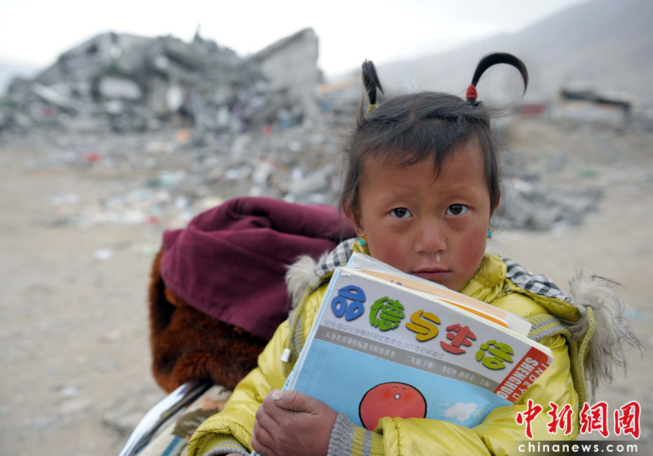 4月17日,一位上小學二年級的女童緊抱著自己的課本,站在震后的廢墟前。4月17日上午,青海省民政廳廳長更陽向媒體發(fā)布了一系列安撫救濟措施,災民生活補助按每人每天15元,每一個死亡人員家庭補助8000元,“三孤”指孤老、孤殘、孤兒補助每人每月1000元,孤兒補助到18歲止。中新社發(fā) 陳文 攝
