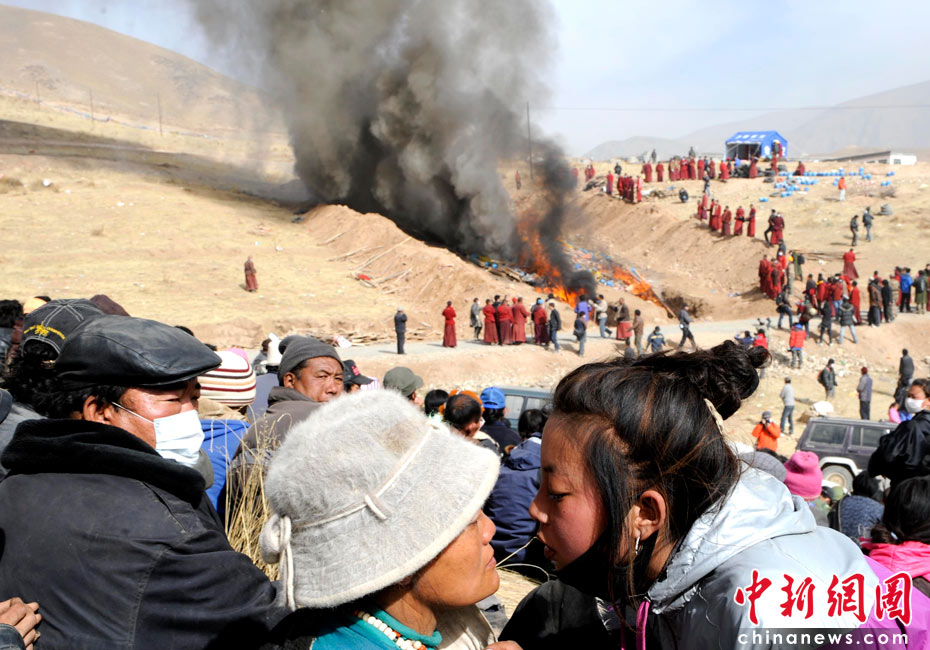 4月17日,青海省玉樹(shù)縣結(jié)古鎮(zhèn)附近的山坡上,眾多地震遇難者遺體被火葬。當(dāng)日,為妥善及時(shí)處理遇難人員遺體,預(yù)防災(zāi)區(qū)疫情的發(fā)生與流行,青海出臺(tái)地震遇難人員遺體處理意見(jiàn),強(qiáng)調(diào)在處理遺體時(shí)要尊重少數(shù)民族喪葬習(xí)俗,尊重死者尊嚴(yán)。中新社發(fā) 廖攀 攝