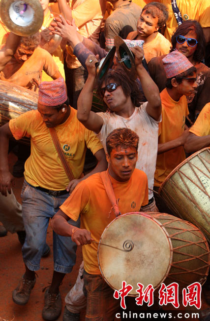4月15日,尼泊爾迎來一年一度的傳統節(jié)日“尼歷新年”。當日全國放假一天,在加德滿都郊區(qū)人們涌上街頭潑灑紅粉慶祝新年。圖片來源:中國新聞網