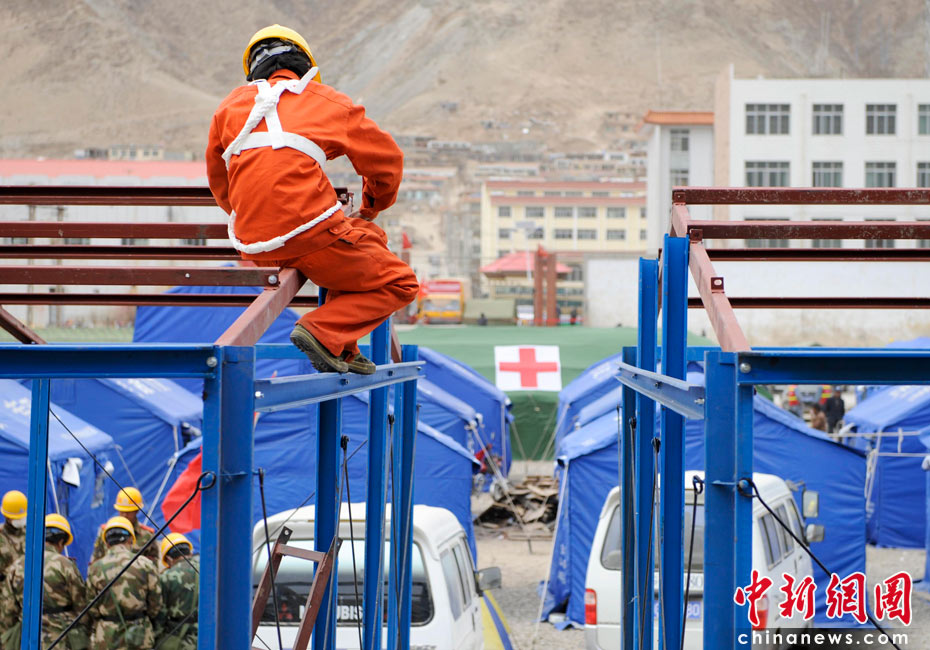 4月17日,青海玉樹體育場受災(zāi)民眾安置點(diǎn),工人們安裝臨時板房。中新社發(fā) 廖攀 攝