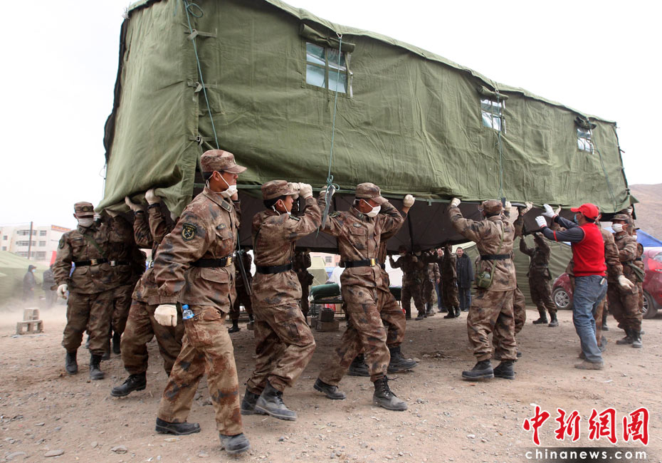 4月17日,青海玉樹體育場受災(zāi)民眾安置點內(nèi),解放軍救援隊為安置點整體搬遷帳篷。中新社發(fā) 盛佳鵬 攝