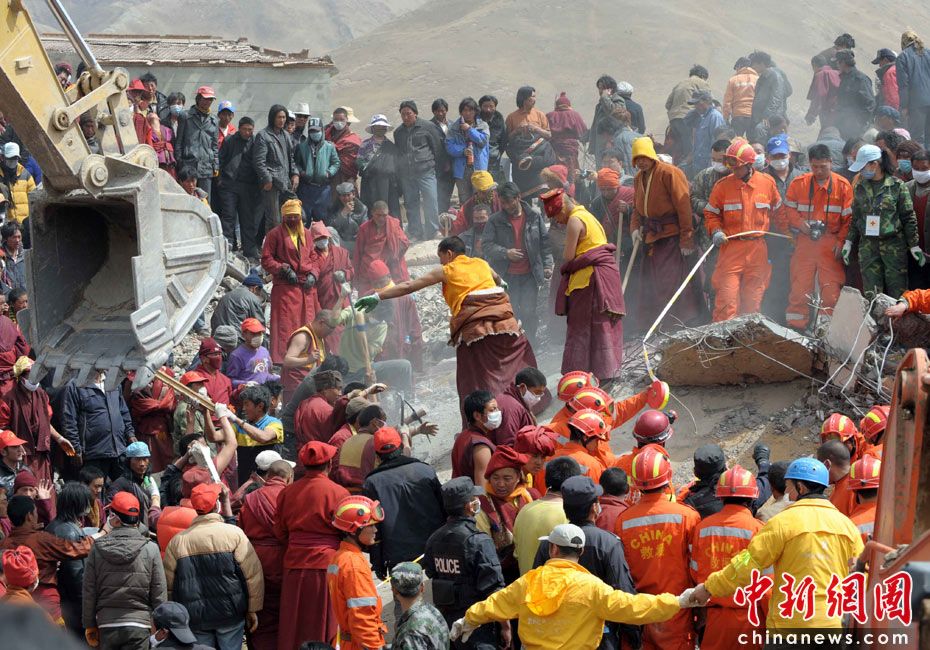 4月17日,中國(guó)地震救援隊(duì)、四川救援隊(duì)在玉樹結(jié)古鎮(zhèn)三岔路城建一號(hào)商鋪展開搜救,救援隊(duì)員、僧人、志愿者等在同一搜救點(diǎn)連續(xù)奮戰(zhàn)。中新社發(fā) 陳文 攝