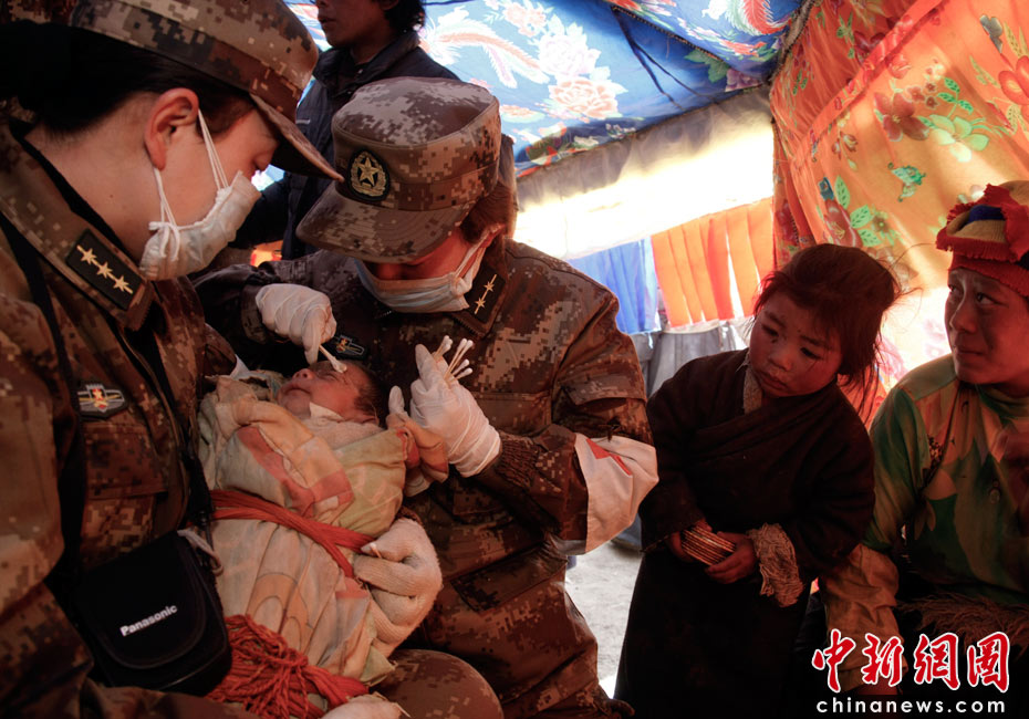 4月18日,總后青藏兵站部抗震醫(yī)療隊在青海玉樹震中結古鎮(zhèn)展開救援的同時,還派員向周邊牧區(qū)巡診,救治傷病員。圖為醫(yī)務人員為黃林格頭牧區(qū)索南求幾的嬰兒進行檢查和護理。據悉,這個牧區(qū)所有房屋在地震中被損毀,不少牧民在地震中受傷,目前住在搭建的帳篷里。中新社發(fā) 鄒小慶 攝