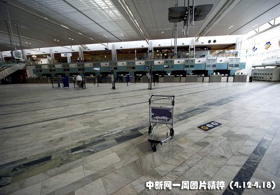瑞典一機場大廳辦理登機手續(xù)的窗口前空無一人,此前冰島火山噴發(fā)產(chǎn)生的火山灰導(dǎo)致歐洲多個機場被迫關(guān)閉。