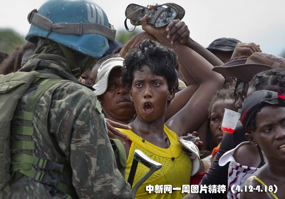 4月12日周一,海底太子港一個(gè)無家可歸的地震幸存者與前來分發(fā)食品的巴西聯(lián)合國(guó)維和人員發(fā)生口角。
