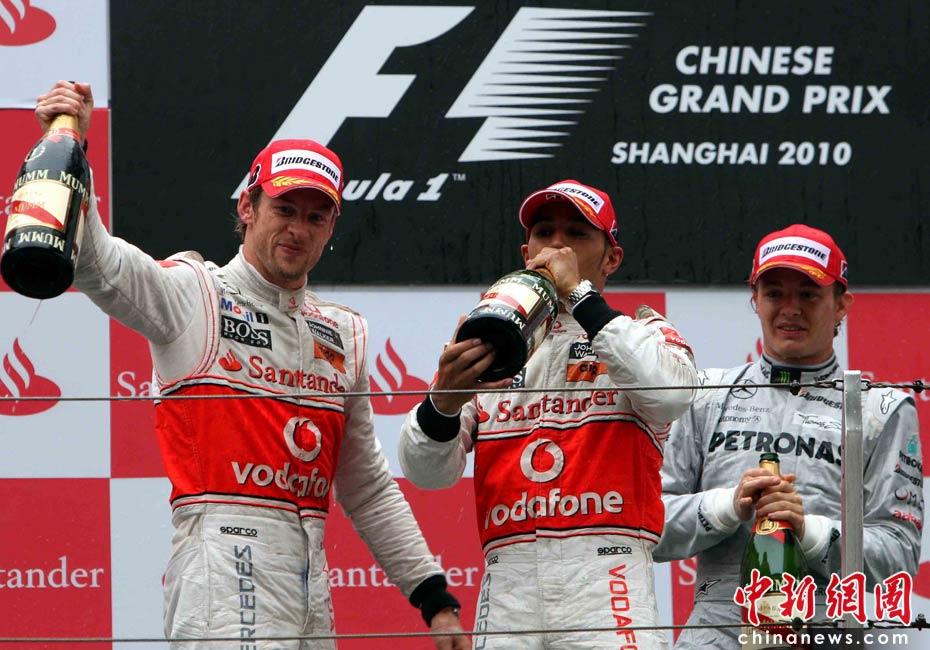 4月18日下午,2010國際汽聯(lián)F1世界錦標(biāo)賽上海站在上海國際賽車場(chǎng)舉行正式比賽,邁凱輪車隊(duì)的英國車手巴頓(左)在雨中獲得冠軍、隊(duì)友、英國車手漢密爾頓(中)獲得亞軍,梅賽德斯GP車隊(duì)的德國車手羅斯伯格獲得季軍。中新社記者 任晨鳴 攝