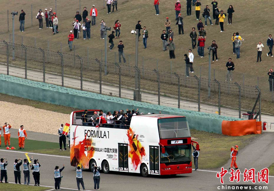 4月18日下午,2010國(guó)際汽聯(lián)F1世界錦標(biāo)賽上海站在上海國(guó)際賽車場(chǎng)舉行正式比賽,賽前24名參賽車手按照慣例乘坐敞篷車環(huán)繞賽場(chǎng)一周與車迷見(jiàn)面,但是寥寥無(wú)幾的觀眾與陰沉的天氣使上海F1賽事創(chuàng)下開(kāi)賽七年以來(lái)觀眾人數(shù)最低的紀(jì)錄。中新社記者 任晨鳴 攝