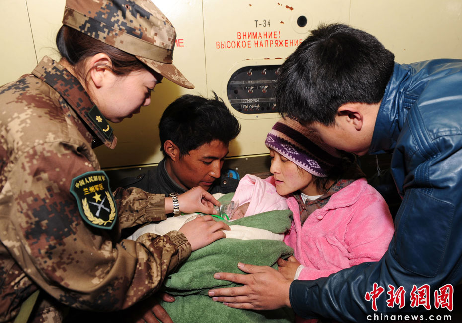4月18日上午9點10分,剛剛到達玉樹機場正在卸下救災(zāi)物資的廣空運輸航空兵某師劉軍機組,聽說有名早產(chǎn)兒急需轉(zhuǎn)送蘭州軍區(qū)總醫(yī)院救治,僅用15分鐘準(zhǔn)備,9點25分飛機提前起飛。懷孕8個多月藏族婦女尼瑪拉毛,由于地震驚嚇導(dǎo)致早產(chǎn)。當(dāng)日凌晨4點轉(zhuǎn)院途中,在蘭州軍區(qū)323醫(yī)院婦產(chǎn)醫(yī)生王小特、盧小娟的幫助下,產(chǎn)下一男嬰。由于早產(chǎn)、產(chǎn)程長,嬰兒嚴(yán)重缺氧,發(fā)生紫疳,為了盡快挽救嬰兒生命,準(zhǔn)備轉(zhuǎn)往蘭州軍區(qū)總醫(yī)院。圖為蘭州軍區(qū)323醫(yī)院救護隊員隨機救護。中新社發(fā) 沈玲 攝