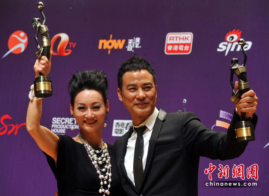 4月18日晚,“第二十九屆香港電影金像獎”頒獎典禮在香港文化中心大劇院隆重舉行。分別奪得最佳男女主角獎項的香港藝人任達(dá)華及惠英紅向媒體展示獎項并合照。中新社發(fā) 鄧慶樂 攝
