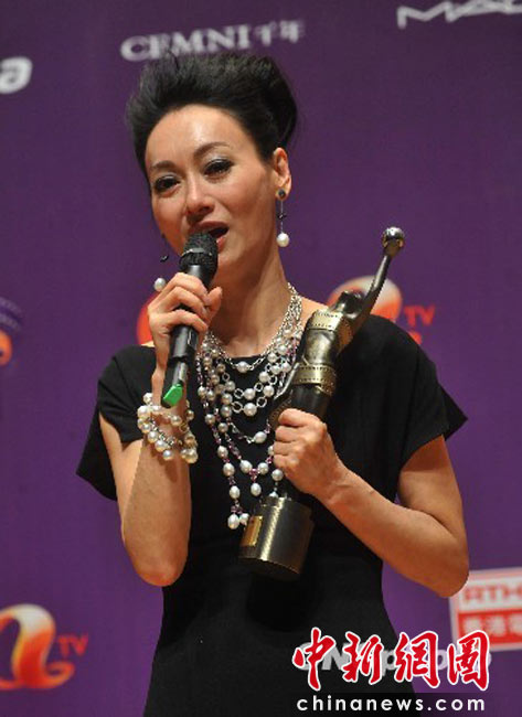 4月18日晚,“第二十九屆香港電影金像獎(jiǎng)”頒獎(jiǎng)典禮在香港文化中心大劇院隆重舉行,影星惠英紅憑演出電影“心魔”奪得最佳女主角獎(jiǎng)項(xiàng)。圖為惠英紅手持獎(jiǎng)座向媒體暢談感受。 中新社發(fā) 鄧慶樂(lè) 攝
