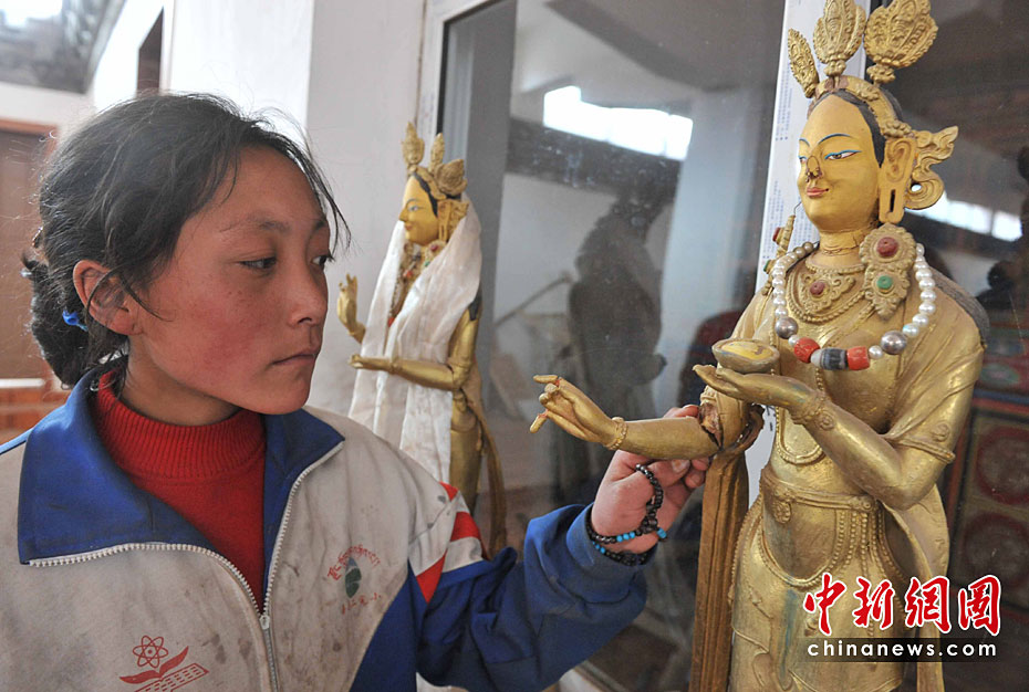 4月19日,新聞?dòng)浾呤状芜M(jìn)入青海玉樹7.1級(jí)強(qiáng)烈地震的震中點(diǎn)上拉秀鄉(xiāng)日麻村,奇跡是全村無一傷亡,位于村中心、正在新修的查榮寺里,兩尊文成公主的塑像局部損壞。中新社發(fā) 賈國榮 攝