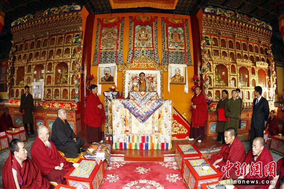 4月20日上午9時(shí)許,十一世班禪額爾德尼·確吉杰布在北京西黃寺,為青海玉樹(shù)地震遇難同胞舉行超度法會(huì)。中新社發(fā) 杜洋 攝