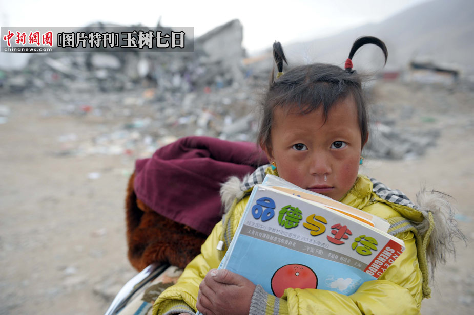 一位上小學二年級的女童緊抱著自己的課本,站在震后的廢墟前。中新社發(fā) 陳文 攝