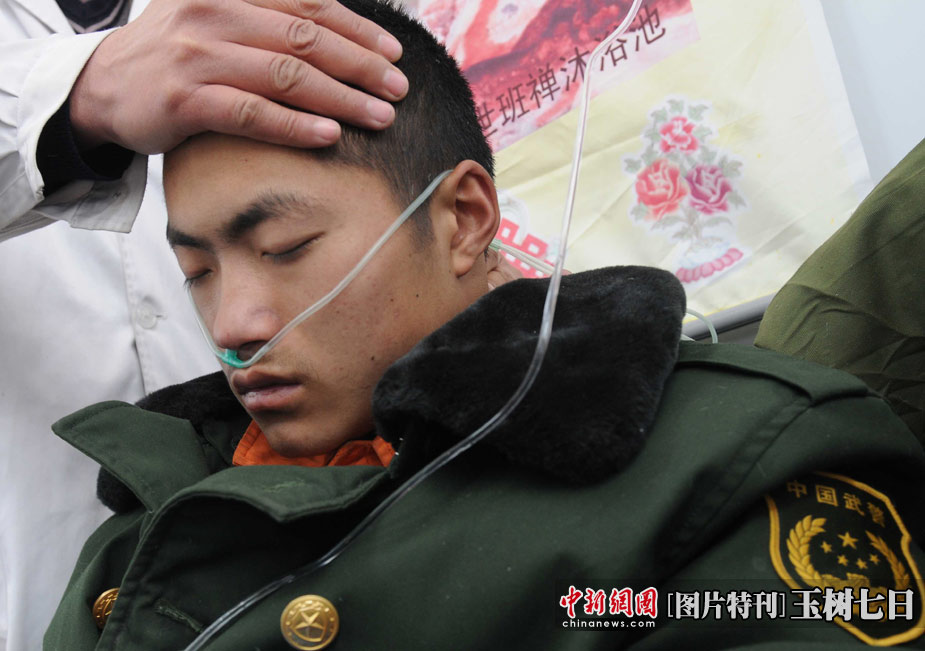 4月18日清晨,玉樹昨夜寒風(fēng)冰雹使地震災(zāi)區(qū)雪上加霜。部分救援人員出現(xiàn)嚴(yán)重高原反應(yīng)。中新社發(fā) 賈國榮 攝