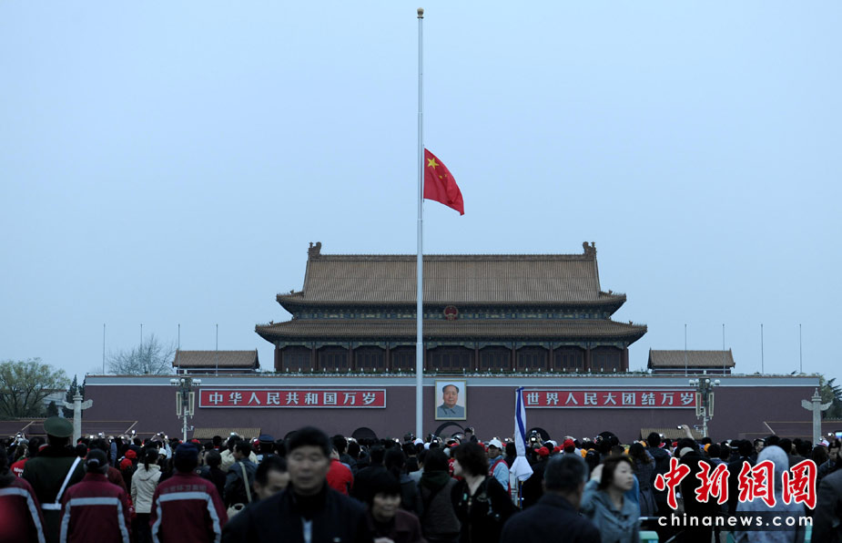 4月21日,北京天安門(mén)廣場(chǎng)升國(guó)旗儀式結(jié)束后,下半旗向玉樹(shù)地震遇難同胞志哀。為表達(dá)全國(guó)各族人民對(duì)青海玉樹(shù)地震遇難同胞的深切哀悼,中國(guó)國(guó)務(wù)院決定,舉行全國(guó)哀悼活動(dòng),全國(guó)和駐外使領(lǐng)館下半旗志哀,停止公共娛樂(lè)活動(dòng)。中新社發(fā) 劉震 攝