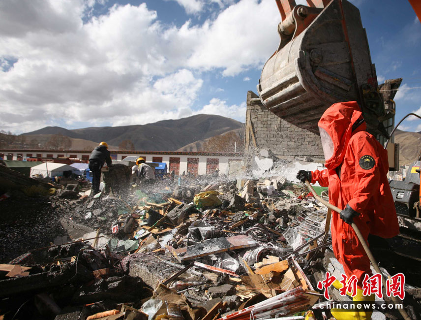 4月20日,來自四川內(nèi)江軍分區(qū)陸軍預(yù)備役防化團開始對玉樹城區(qū)廢墟展開消毒工作。地震發(fā)生以后衛(wèi)生部門加強對震區(qū)消毒防疫工作力度,防疫人員開始對廢墟、災(zāi)民安置區(qū)展開拉網(wǎng)式消毒防疫,重點預(yù)防鼠疫、水質(zhì)污染,確保大災(zāi)之后無大疫。中新社發(fā) 劉忠俊 攝