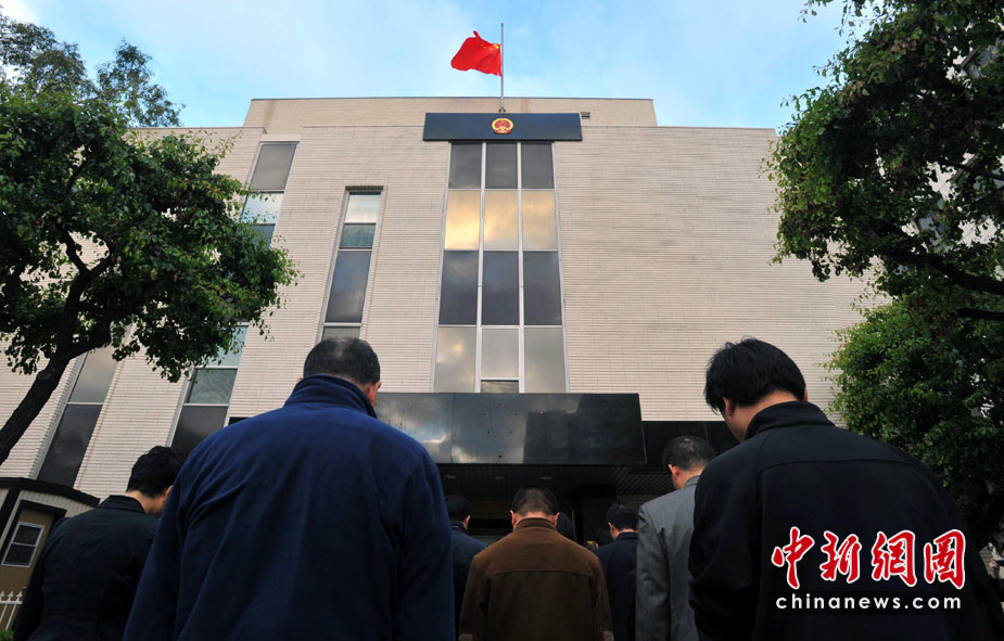 當?shù)貢r間4月21日清晨,中國駐洛杉磯總領(lǐng)事館在總領(lǐng)館大樓前舉行降半旗儀式,向青海玉樹地震遇難同胞表示深切悼念。中新社發(fā) 張煒 攝