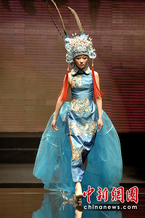 4月20日晚,首屆海西國際時裝周在福建石獅閉幕,本屆時裝周吸引了來自海峽兩岸的紡織服裝界企業(yè)家和知名服裝設(shè)計師。期間舉辦了12場時裝品牌和設(shè)計師作品動態(tài)發(fā)布會。圖為模特展示古今潮流結(jié)合的服裝。王東明 攝