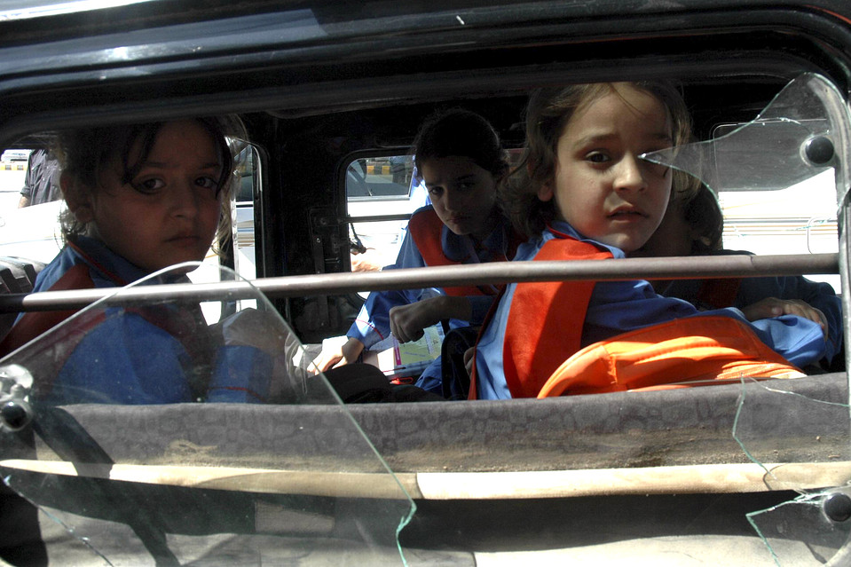 周一(19日),巴基斯坦白沙瓦發(fā)生炸彈爆炸事件。圖為學(xué)生坐在炸彈攻擊后的車(chē)內(nèi)。