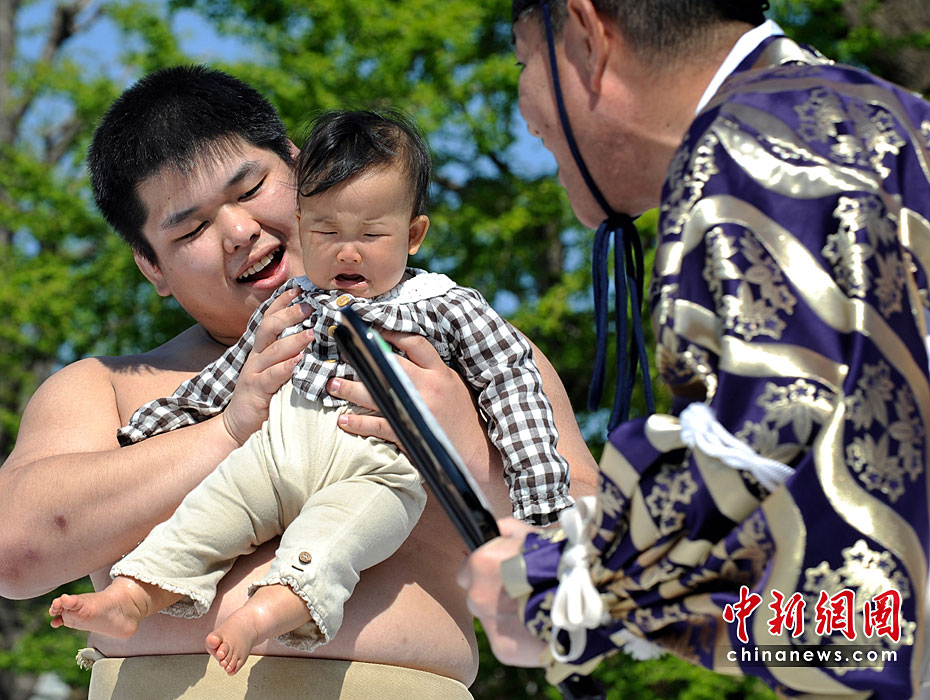 4月25日,日本東京,幾名相撲手手抱嬰兒,正努力使嬰兒哭泣。當(dāng)日,一年一度的日本一周歲以下嬰兒啼哭大賽在東京淺草寺舉行。第一個(gè)讓嬰兒哭泣的選手將贏得比賽,日本通過(guò)此種比賽為孩子的健康祈福,他們認(rèn)為嬰兒哭泣將對(duì)他們將來(lái)的身體健康有利。圖片來(lái)源:中國(guó)新聞網(wǎng)