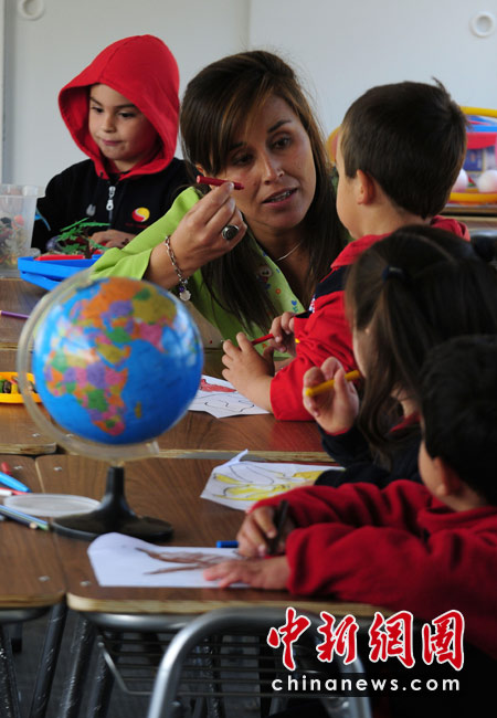 4月26日,今年2月遭受8.8級強烈地震的智利康塞普西翁市,兒童們在“巴士學!崩锷险n。