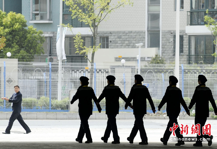 4月27日,上海世博園里一隊(duì)女性安保人員走過引起一旁的男士側(cè)目。中新社發(fā) 廖攀 攝