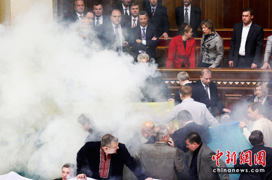 4月27日,基輔,烏克蘭議會(huì)就俄羅斯黑海艦隊(duì)駐扎問題進(jìn)行討論時(shí)出現(xiàn)混亂,數(shù)千人在議會(huì)外示威,會(huì)場(chǎng)內(nèi)有人投擲煙霧彈和雞蛋,大廳內(nèi)煙霧彌漫,場(chǎng)面一度混亂。