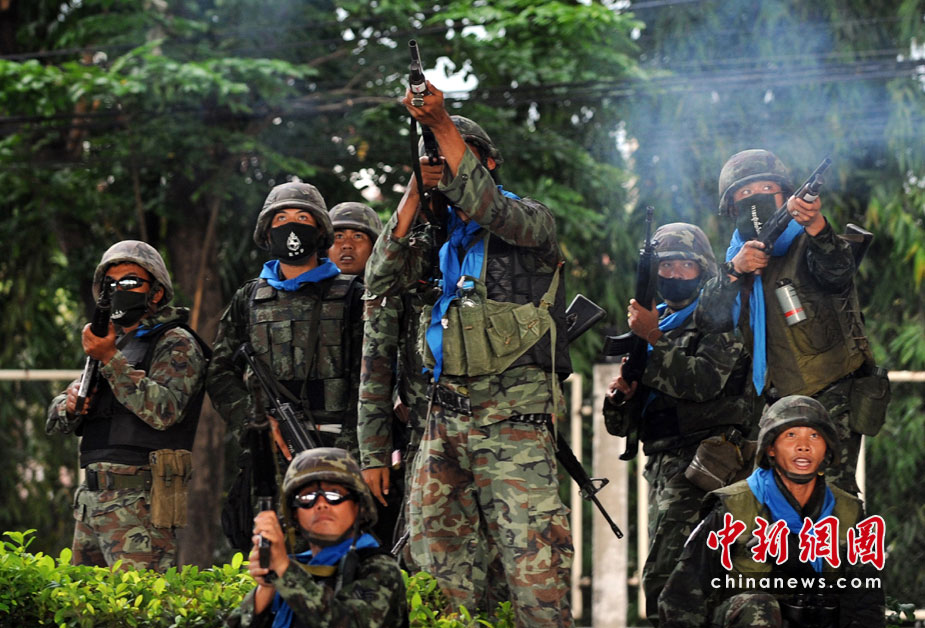 泰國(guó)防暴警察與紅衫軍示威民眾28日下午爆發(fā)沖突,1名士兵頭部被擊中身受重傷,10名示威民眾受傷送醫(yī)。