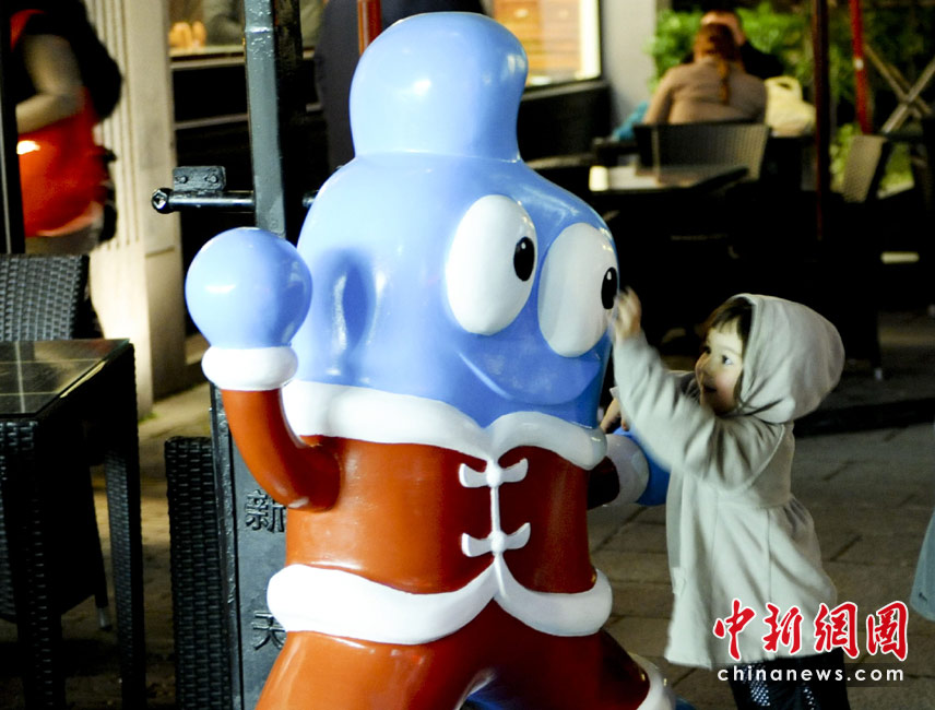 4月26日,一名外國(guó)小女孩在上海新天地的食肆內(nèi)玩味世博會(huì)吉祥物海寶。世博會(huì)開(kāi)幕在即,面臨“大考”的上海充滿(mǎn)喜慶氣氛。 中新社發(fā) 廖攀 攝